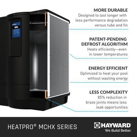 The Hayward HeatPro W3HP21405T Heat Pump delivers powerful, efficient pool heating using advanced Microchannel Heat Exchanger technology that sets a new standard for performance and longevity. By reducing internal brazed joints and refrigerant volume, this design improves reliability while maintaining high thermal efficiency across a wide range of operating conditions. The 140,000 BTU output allows the HeatPro to quickly raise and maintain water temperatures, making it ideal for homeowners looking to maximize pool usage throughout the year.