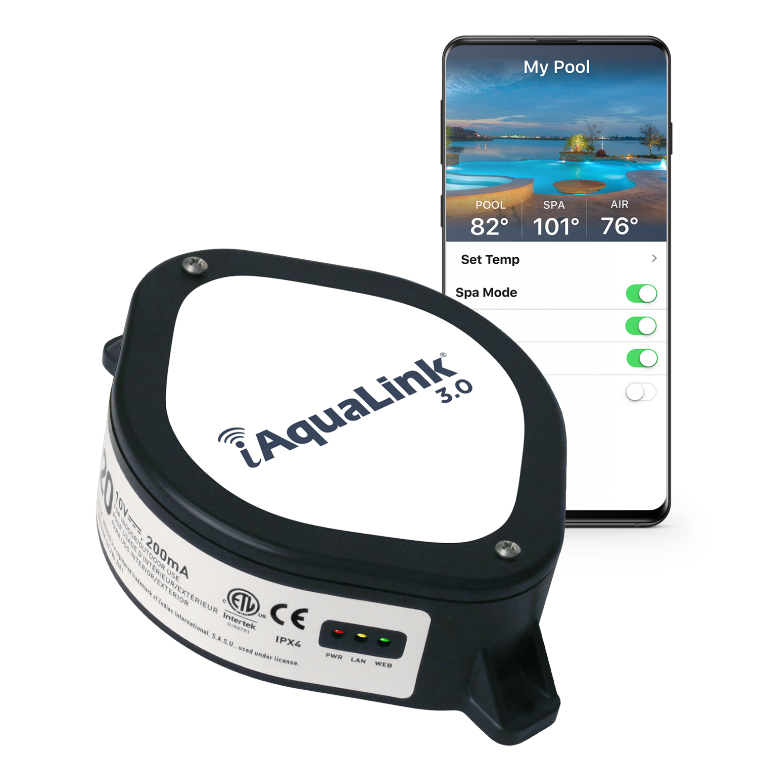 Jandy #IQ20-A iAqualink 2.0 Web Connect Device FEATURES AND BENEFITS Control your pool anytime, anywhere Intuitive and user-friendly mobile pool controller Control multiple pools from a single app Exceptional WiFi reliability with stronger signal strength No unsightly wires, wall panels, or charging bases required Compatible with virtually all residential WiFi and Ethernet networks