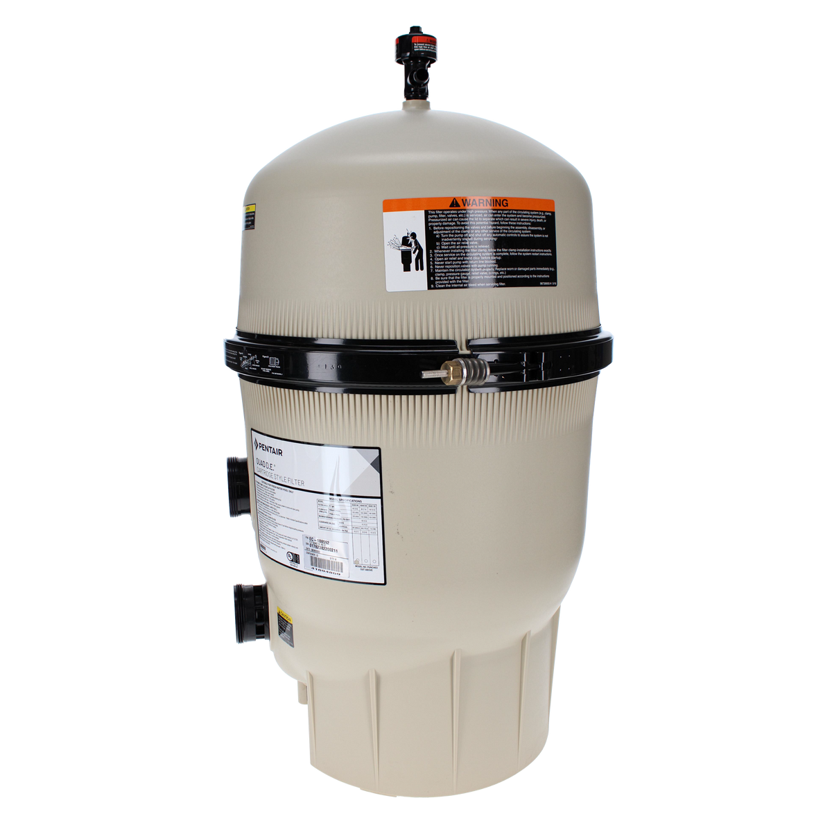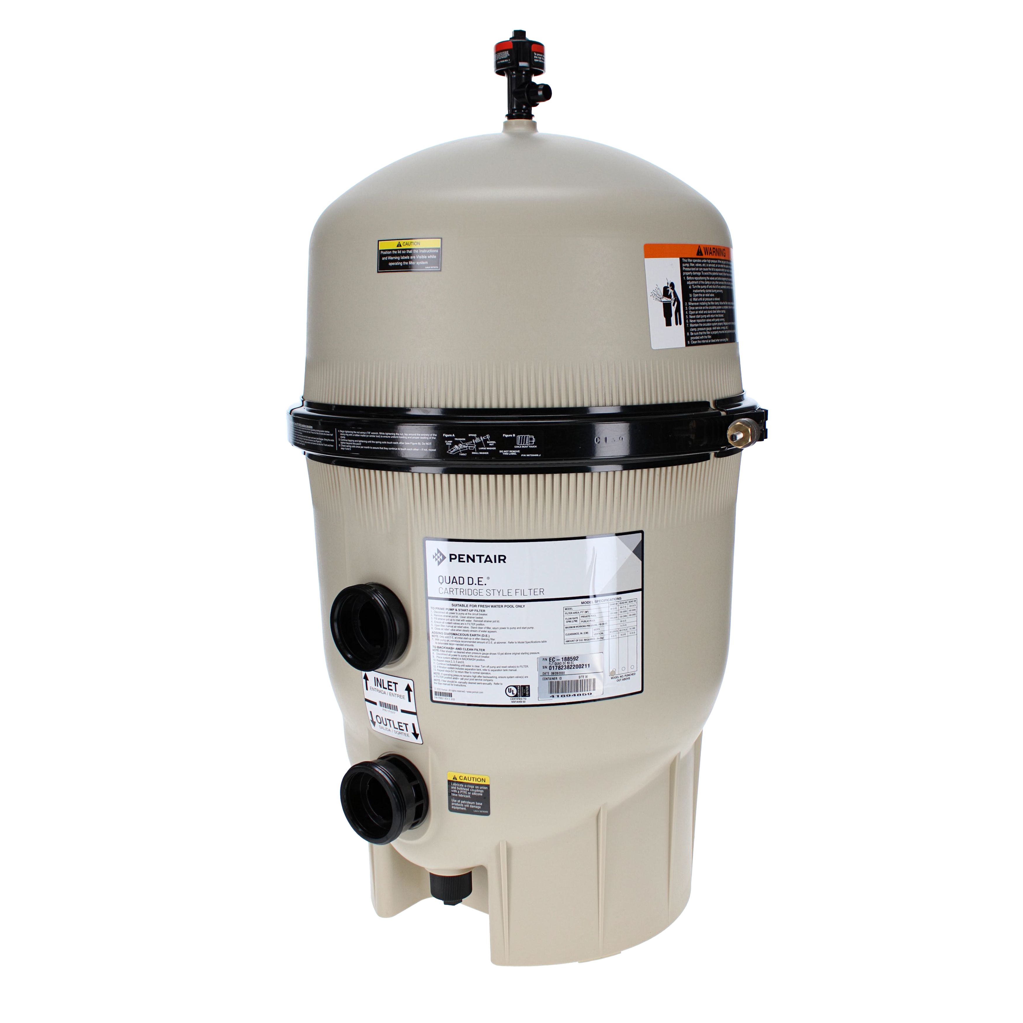 Constructed with a durable fiberglass-reinforced polypropylene tank and secured with a heavy-duty clamp assembly, the Quad D.E. filter is built for long-term outdoor performance. The internal air relief system maintains efficient operation while preventing air buildup. The removable cartridge elements allow multiple cleaning options, including backwashing, rinsing in place, or complete cartridge removal. Designed for use with appropriate multiport or slide valve accessories, the EC-188592 delivers high-efficiency, low-maintenance filtration for residential pool systems.