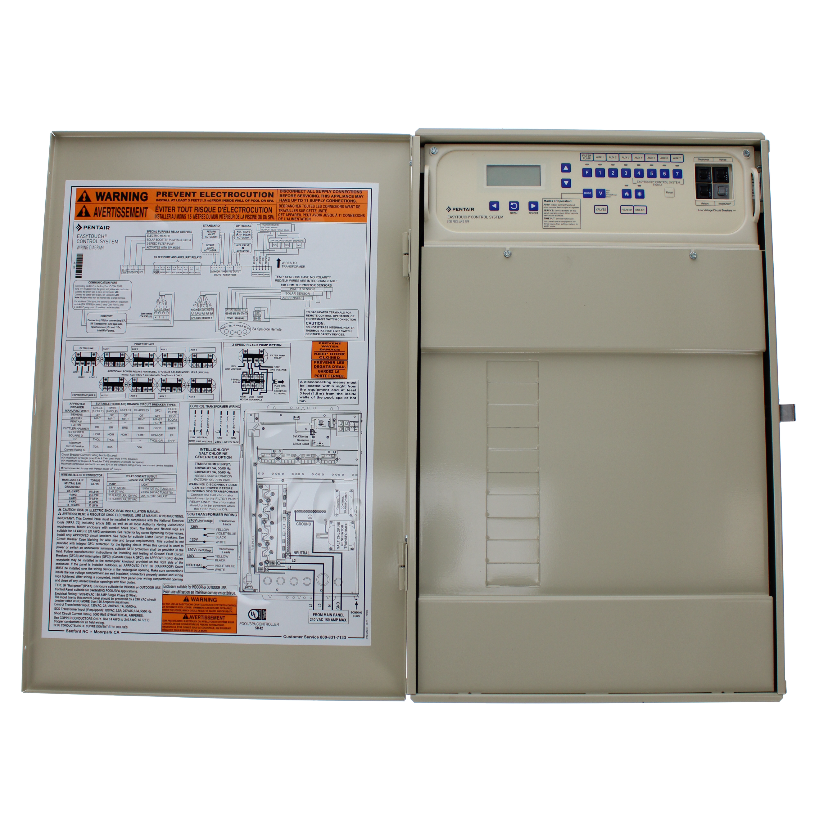 The EasyTouch load center consolidates relays, circuit breakers, and programmable control logic into one enclosure installed at the equipment pad. The intuitive LCD interface allows direct setup of schedules, heater set points, lighting control, and auxiliary features. With support for expansion through wireless remotes, spa-side controllers, and integration with Pentair variable speed pumps and salt chlorine generators, the EC-520540 provides scalable automation and dependable system control for residential pool and spa installations.