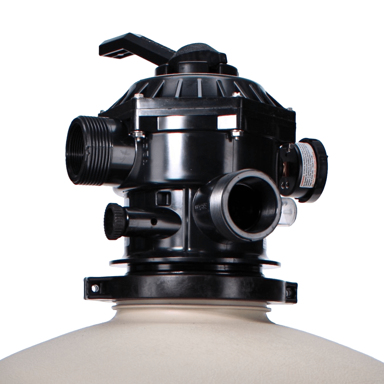• Six-position top mount multiport valve for filter, backwash, rinse, waste, recirculate, and closed functions.