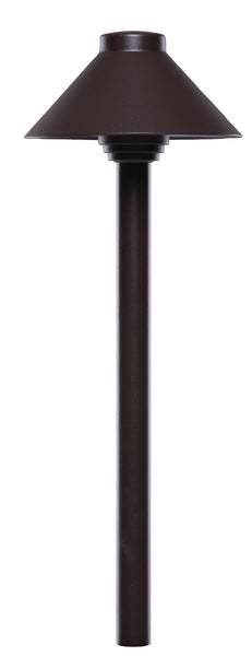 Sollos 910037S Straight Path Light with 5.5" hat and 18" stem in textured bronze. Includes energy-efficient 20W-equivalent JC3 LED lamp, 3000K color temperature, waterproof connectors, and 8" ground stake.