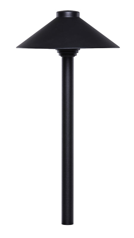 Sollos 911035S Straight Path Light with 7.5" hat and 18" stem in textured black. Comes with energy-efficient 20W-equivalent JC3 LED lamp, warm 3000K color temperature, waterproof connectors, and ETL certification.
