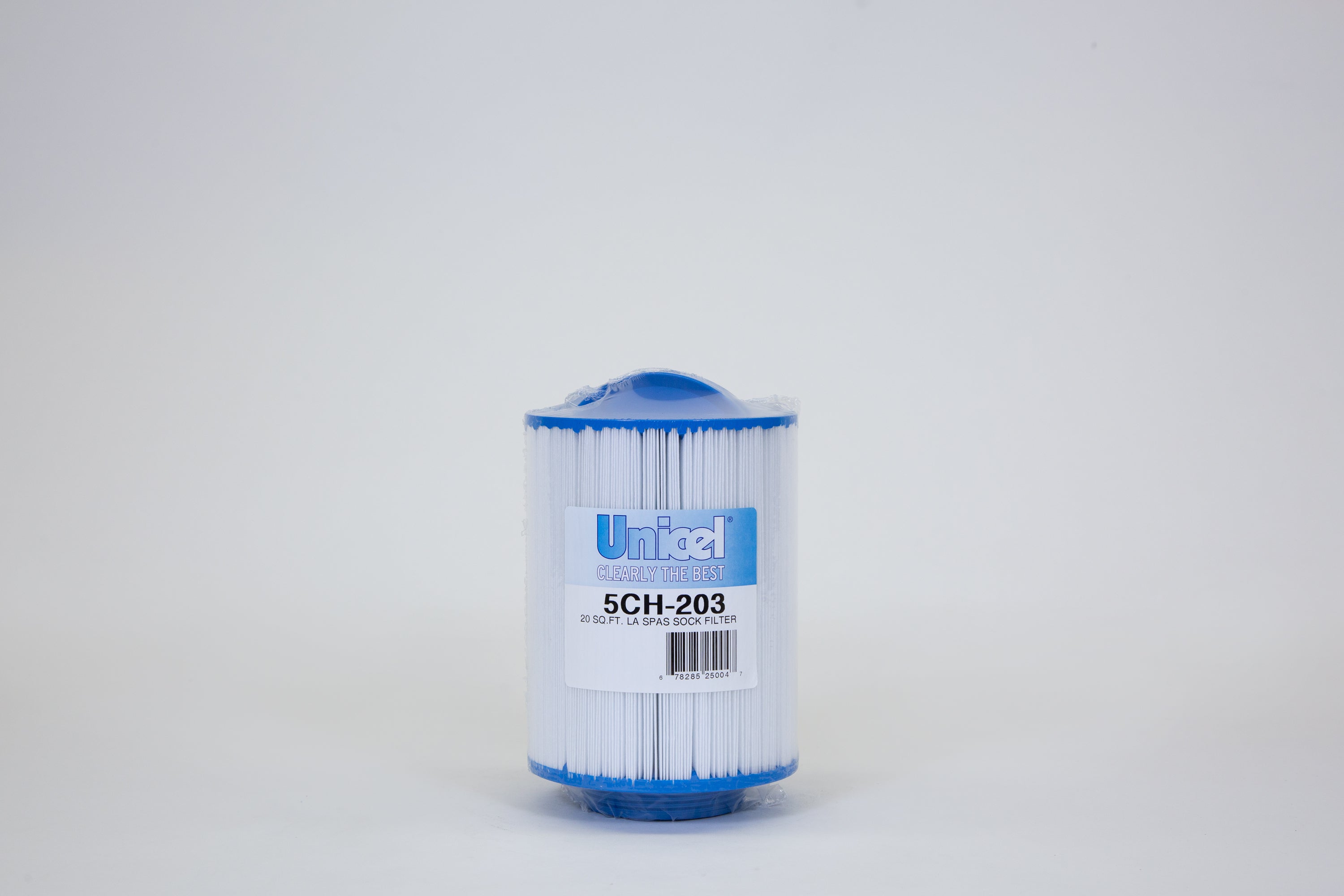 The Unicel 5CH-203 Cartridge Filter is a 20-square-foot premium replacement cartridge designed to replace traditional sock filters used in LA Spas and compatible hot tub systems. It offers superior filtration efficiency, easy maintenance, and longer service life compared to standard fabric filters, providing consistently clean, clear spa water.